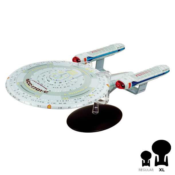 This XL Edition of the Ambassador-class U.S.S. Enterprise-C has been carefully recreated by Eaglemoss, constructed from die-cast metal and high-quality ABS materials. Measuring approximately 10 inches in length, this meticulously detailed model captures the ship’s distinctive design, intricate hull plating, and ambassadorial presence.